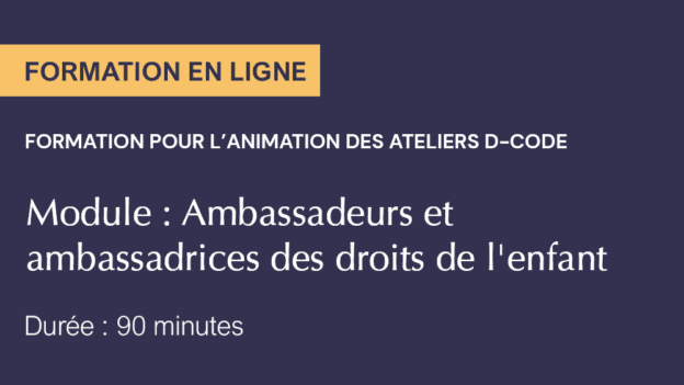 Les ateliers de formation D-CODE visent à outiller les enfants et tout adulte impliqué dans leur développement, à décoder les besoins des enfants et à mettre leurs droits et responsabilités en action.